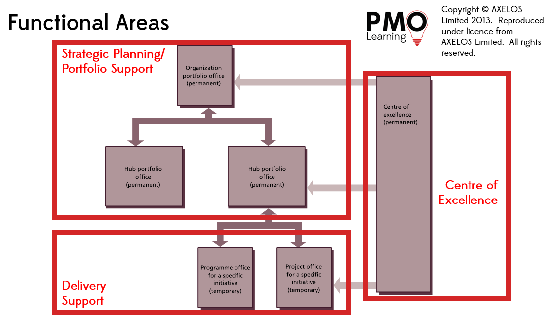 The image also shows the functional areas – or the different types of PMOs and what those PMOs predominantly do. Programme and project offices are mainly providing delivery support, whereas organisational portfolio offices are focused on portfolio management work plus the more strategic planning work.