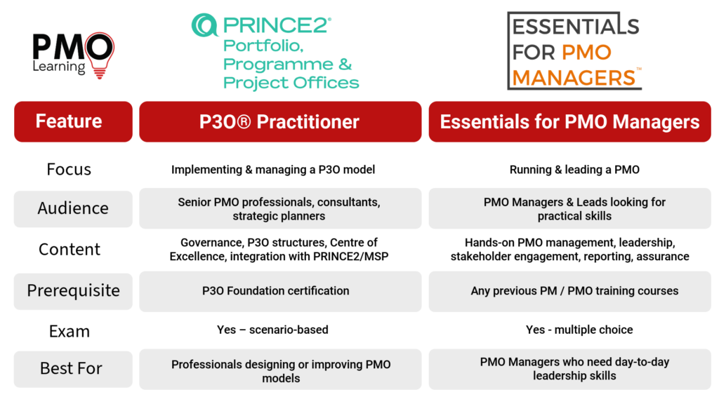 These two courses take very different approaches – one is framework-focused (P3O Practitioner), while the other is practical and hands-on (Essentials for PMO Managers). So, let’s break it down and help you decide which one fits your role and career goals.