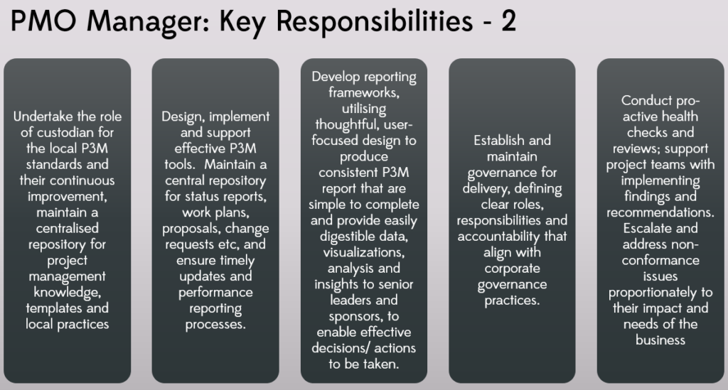 The PMO Manager role is all about taking responsibility for overseeing the operations and functions of the PMO which includes determining which PMO services are offered.