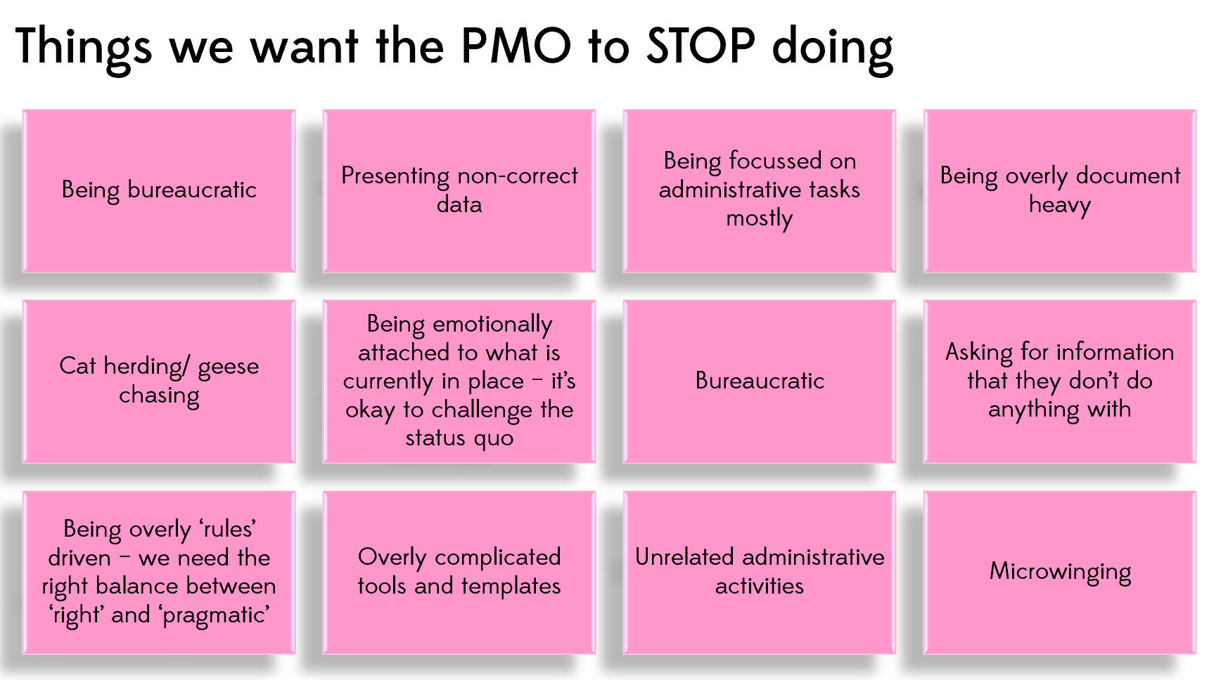- On the pink one, and write down something you would like your PMO to stop doing