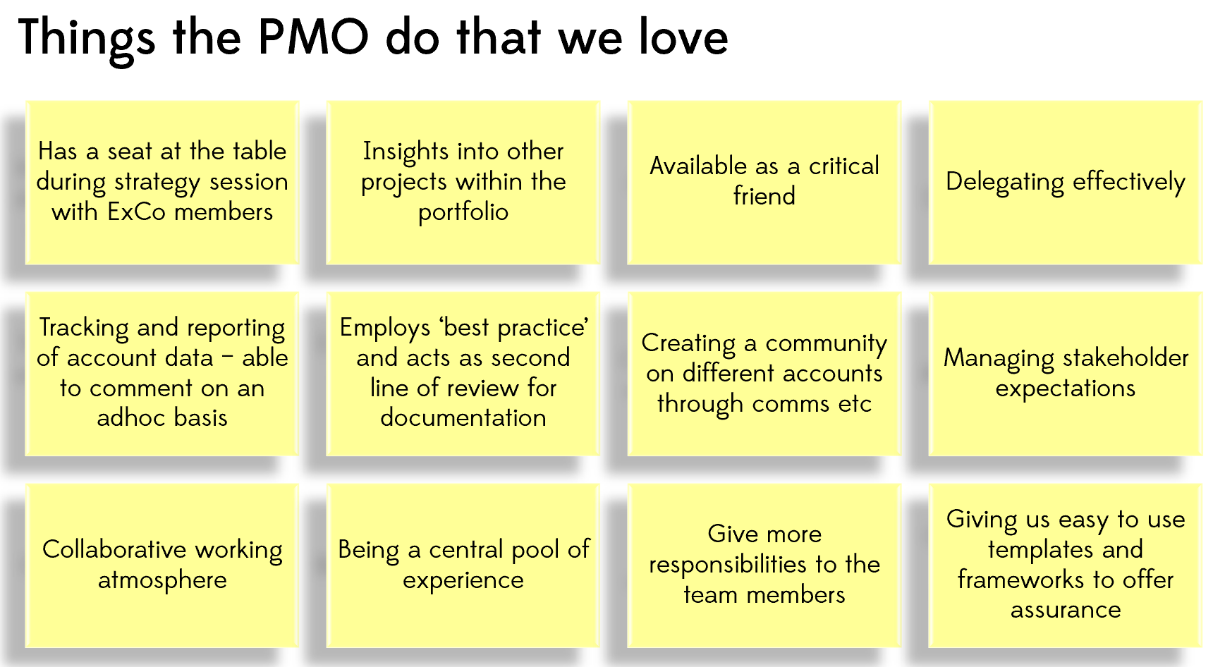 - On the yellow one, and write down what you think is the most valuable thing your PMO does for you