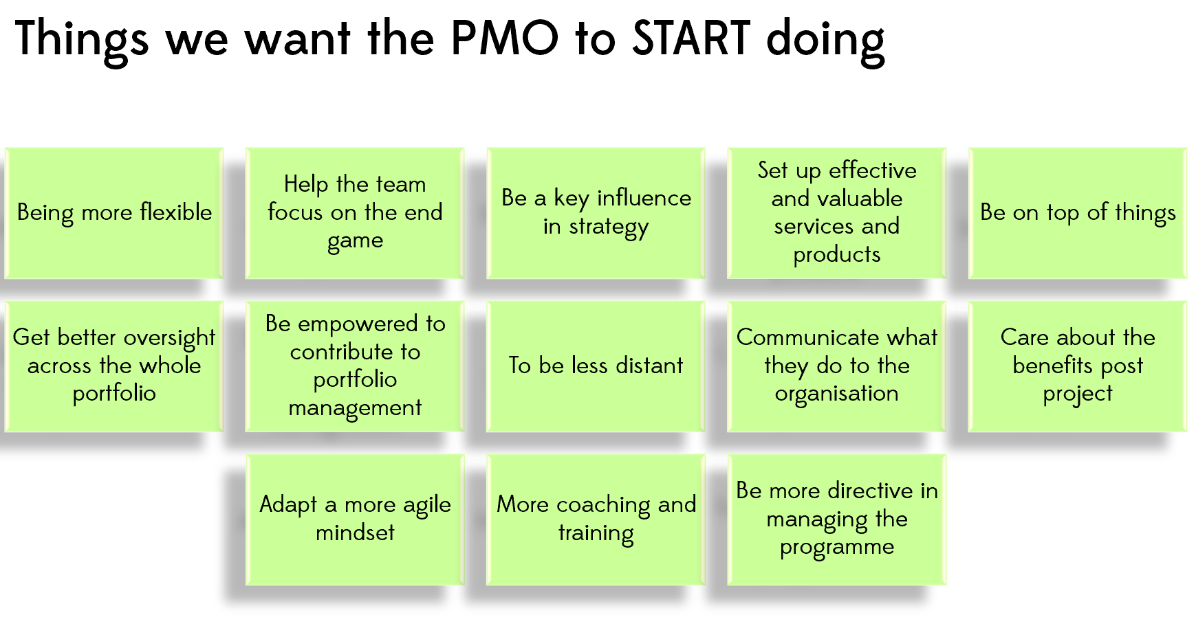 - On the green one, and write down what you would like your PMO to start doing