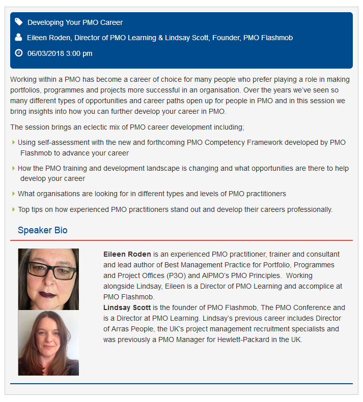 We’re also running a session on the first day in the Learning & Development Zone which is all about your PMO career. Many of you might know that Eileen and I have PMO training (her) and PMO recruitment (me) experience so we thought how about a session that combines both of those.